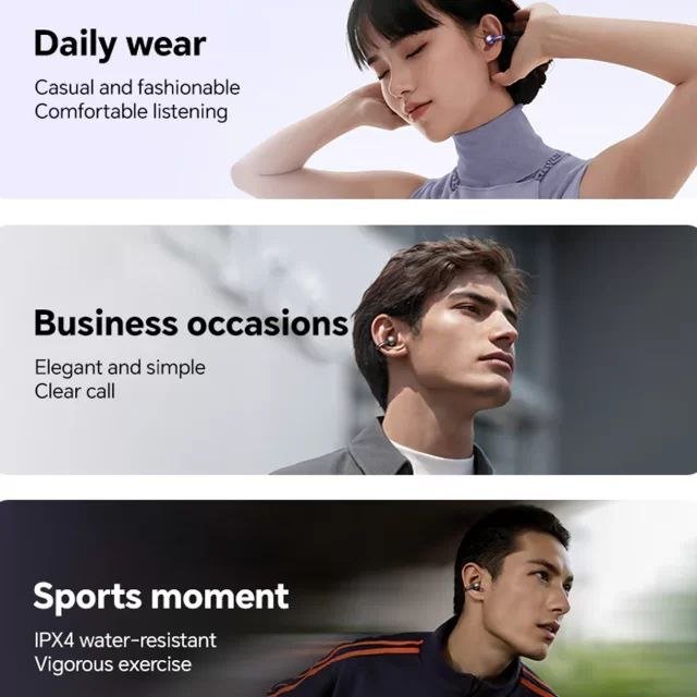 التصميم: سماعات أذن لاسلكية بتصميم مشبك مفتوح للأذن، مما يوفر الراحة ويسمح للمستخدم بسماع الأصوات المحيطة.