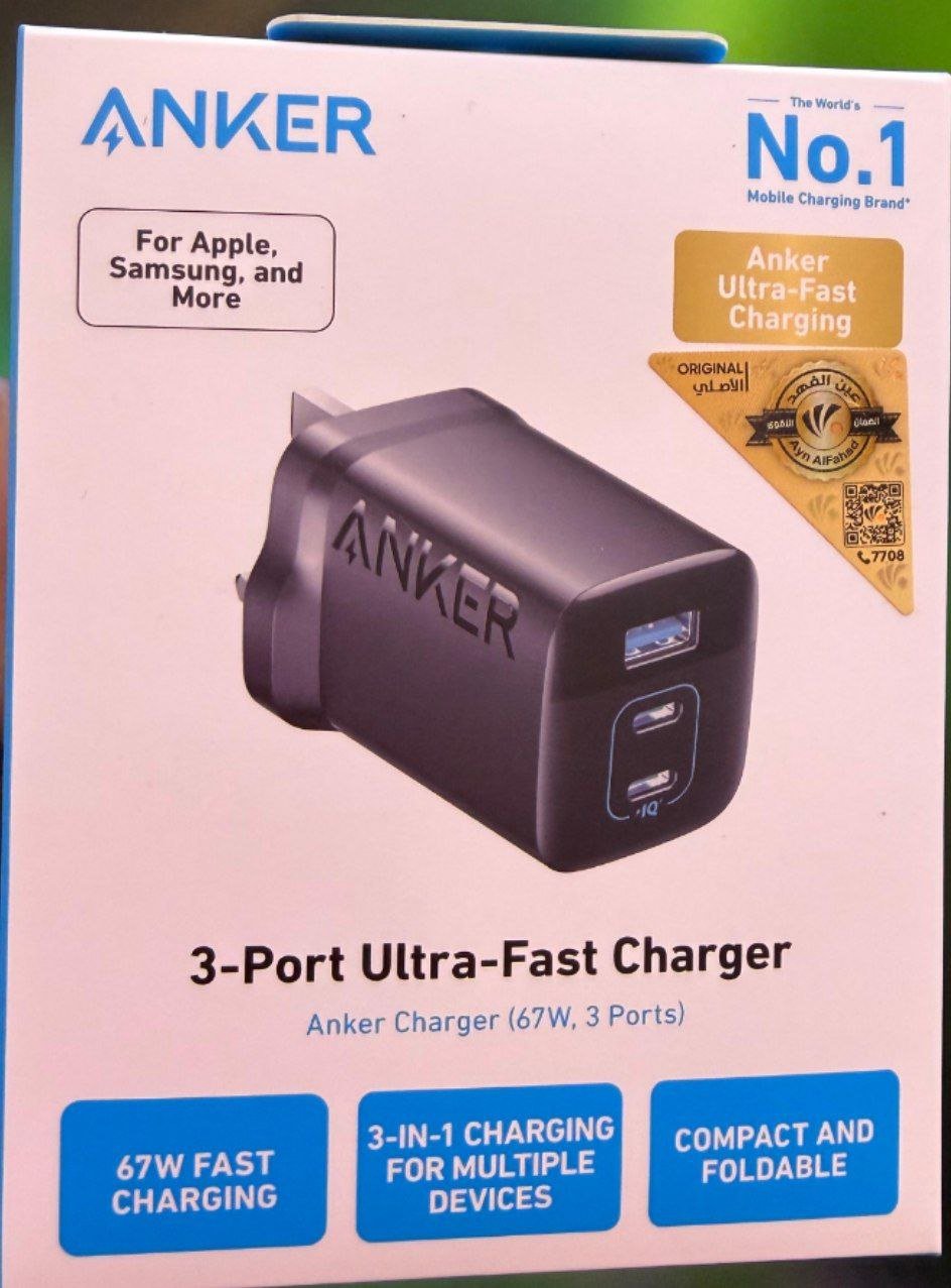 شاحن أنكر فائق السرعة بثلاثة منافذ بقوة 67 واط (Anker 3-Port Ultra-Fast Charger)