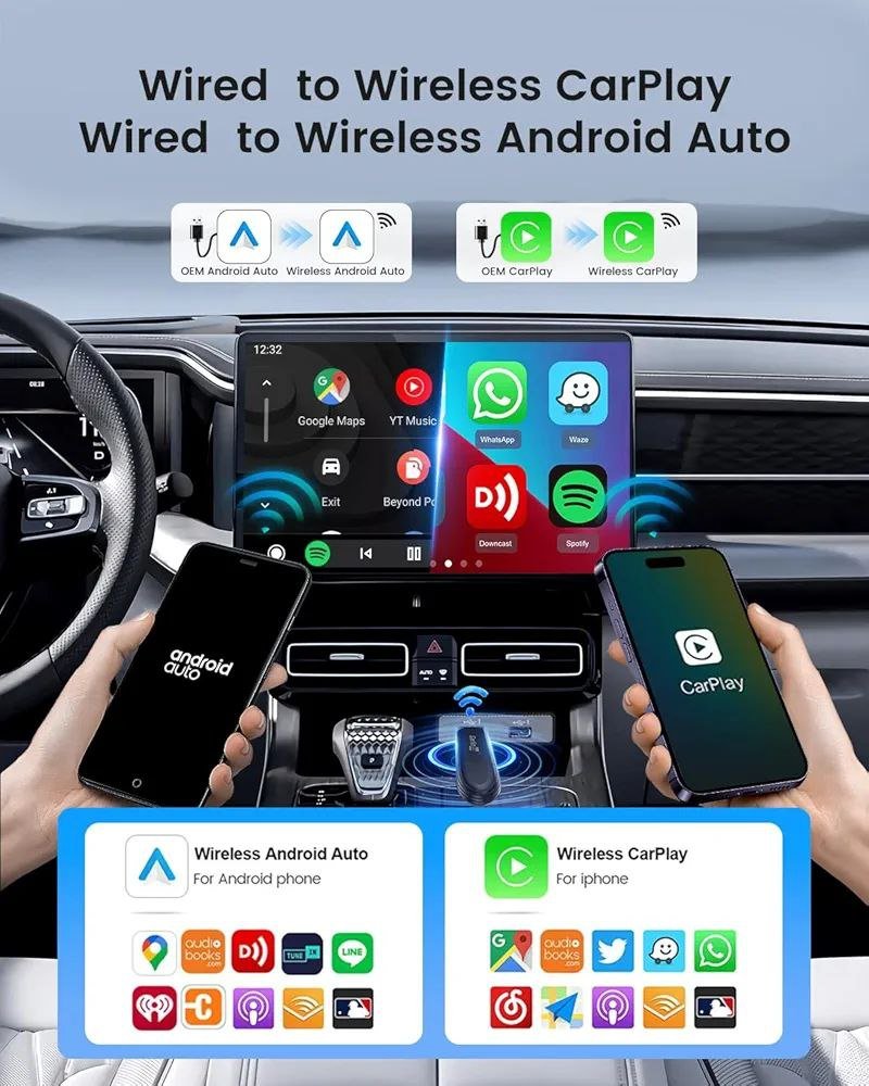 يقوم هذا الجهاز بتحويل نظامي CarPlay و Android Auto السلكيين في سيارتك إلى نظامين لاسلكيين.